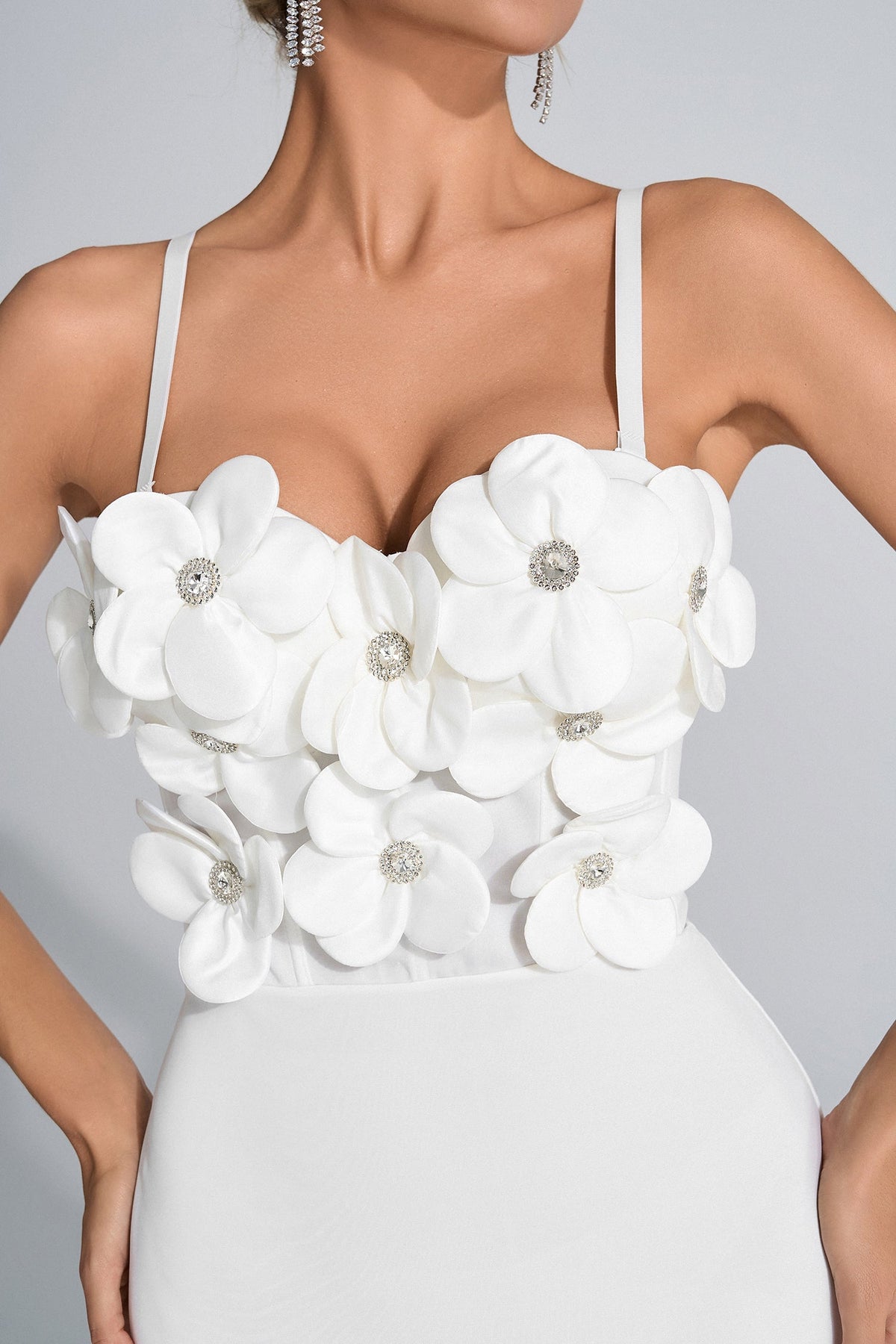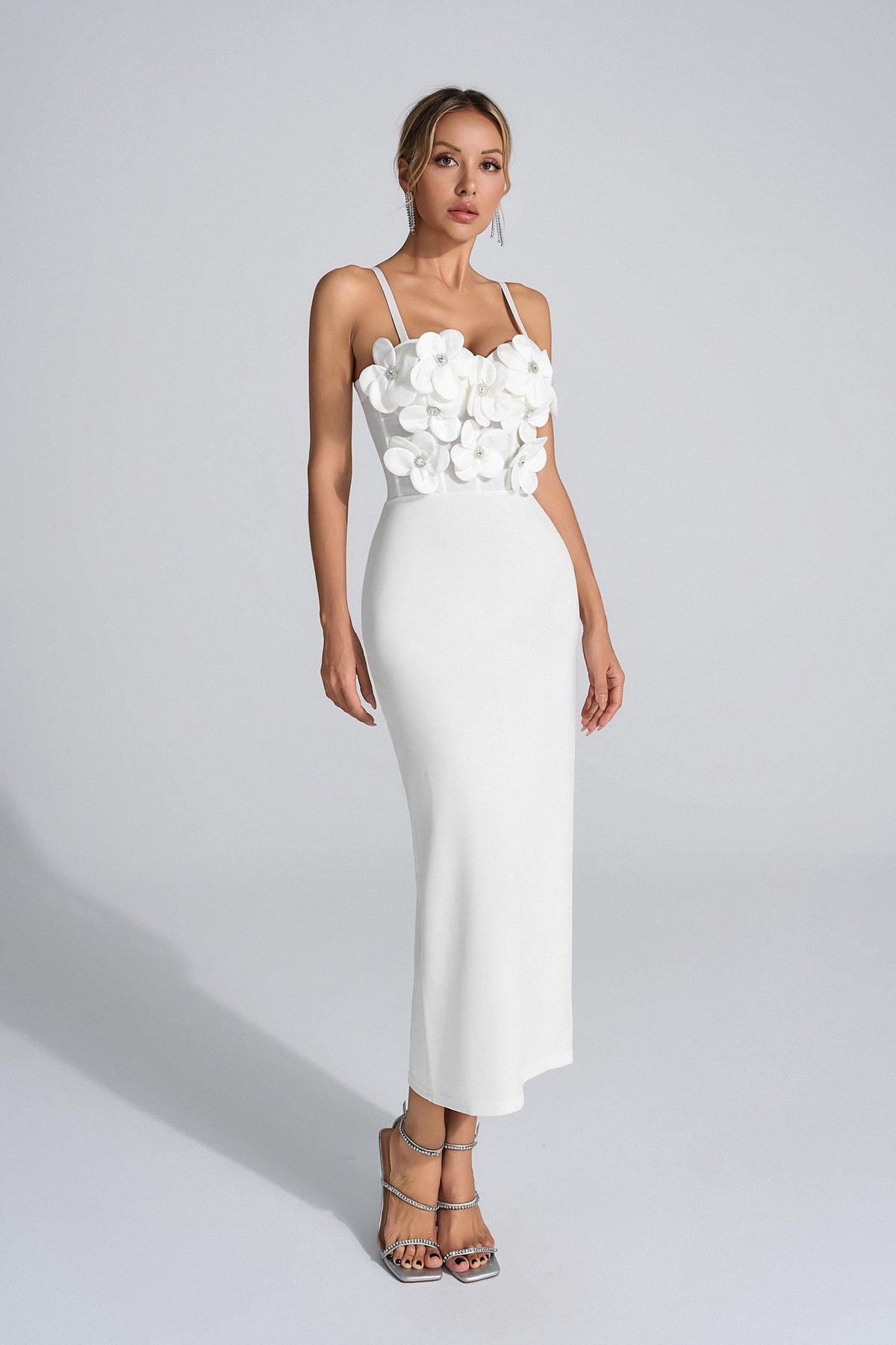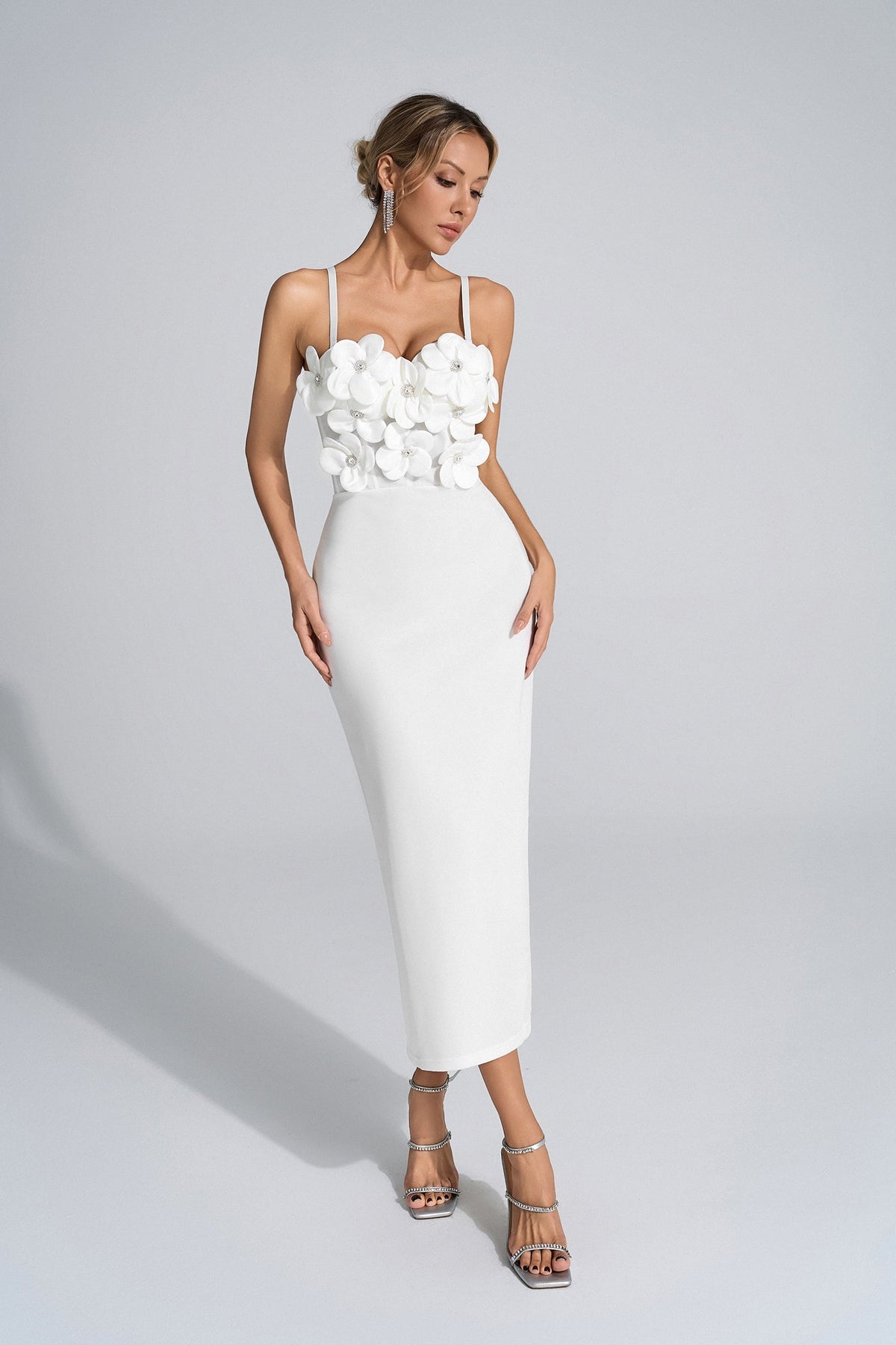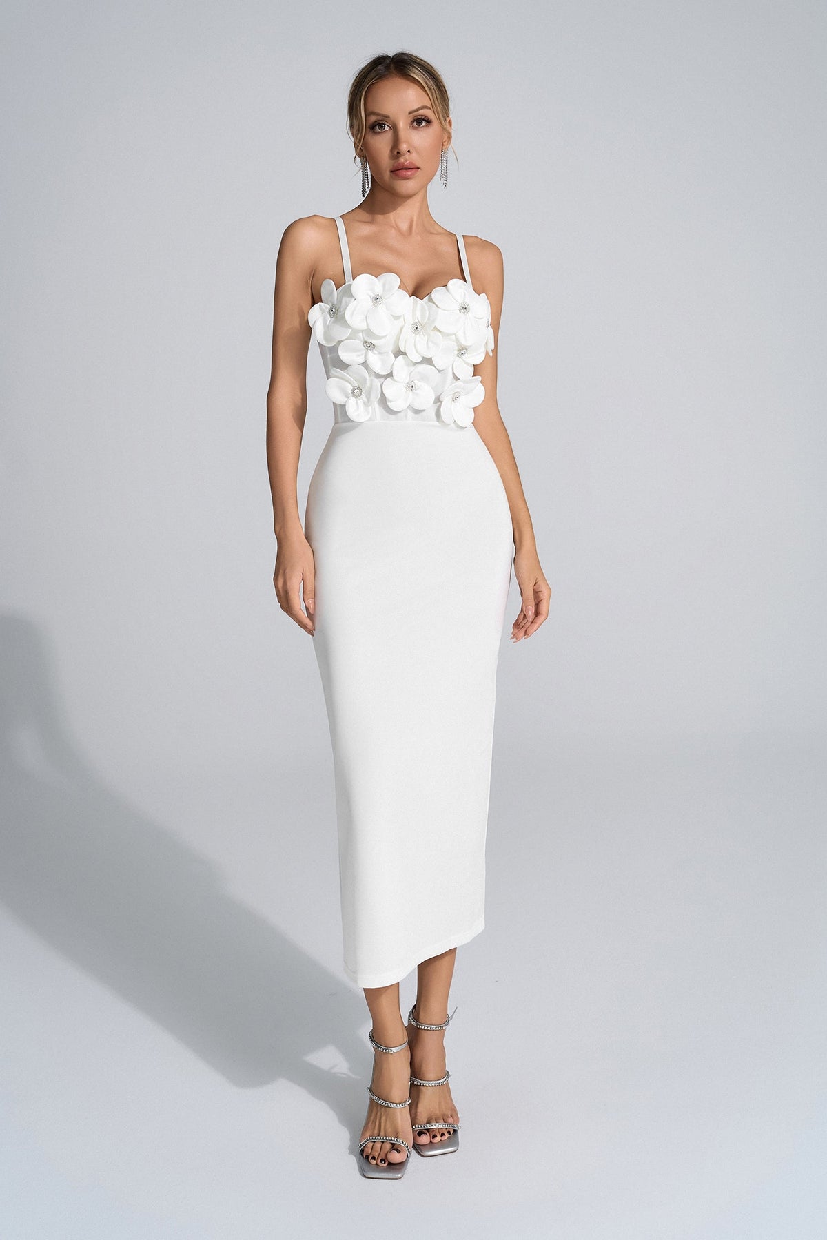Step into elegance with the Galilea White 3D Floral Maxi Dress, a masterpiece of sophistication and style. Adorned with intricate 3D floral embellishments, this dress exudes charm and grace in a timeless midi length. The pristine white hue adds a touch of purity and allure to this enchanting piece, making it ideal for special occasions or elevated everyday wear. Embrace the beauty of delicate florals and refined design with this midi dress that promises to captivate and inspire with its exquisite detailing and effortless charm.